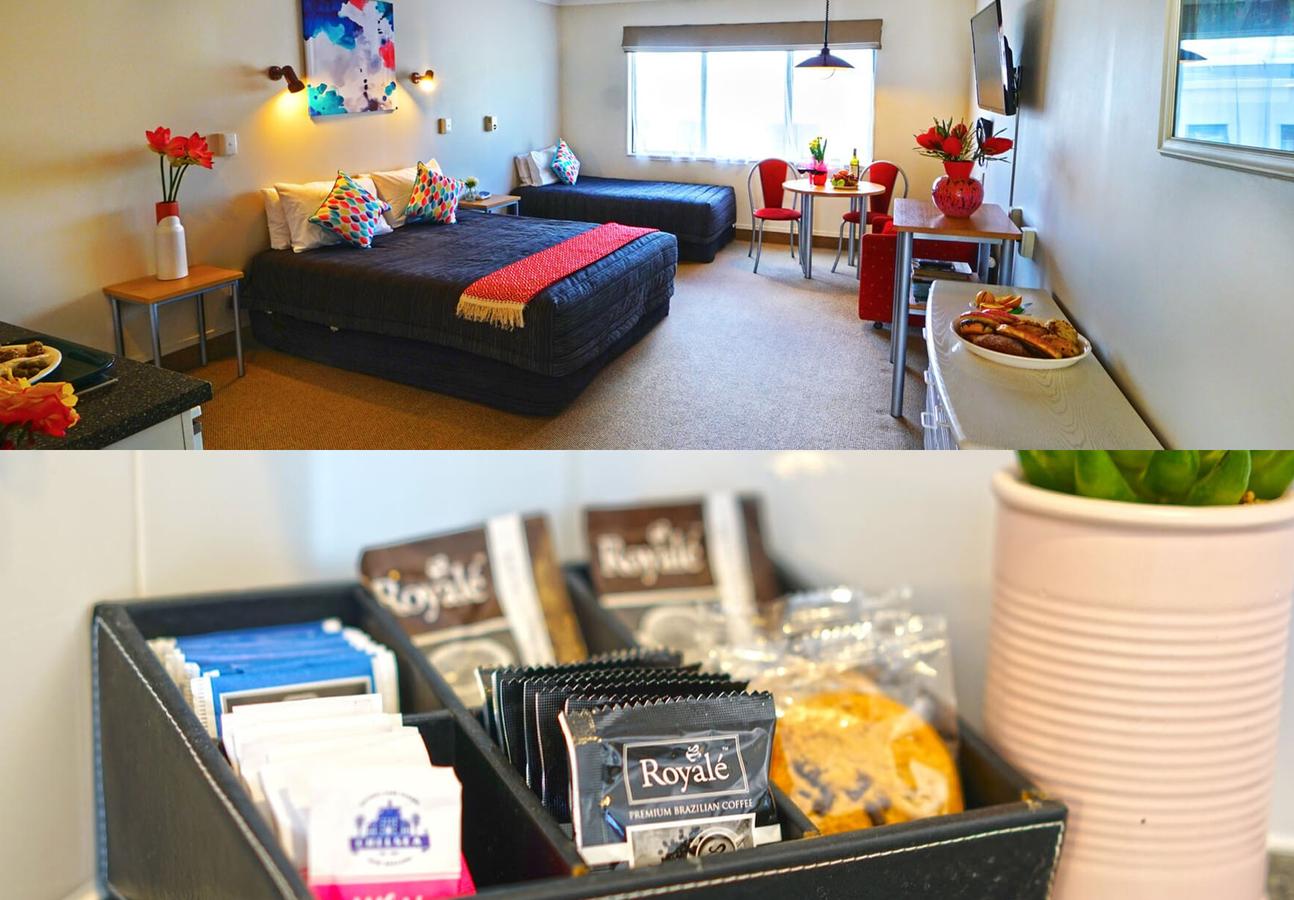 Our spacious studio rooms for three have a queen bed and a single bed, as well as a table and chairs, sofa, and flat screen TV. Each studio has a kitchenette and ensuite making this a comfortable home away from home when you need accommodation in Hamilton.